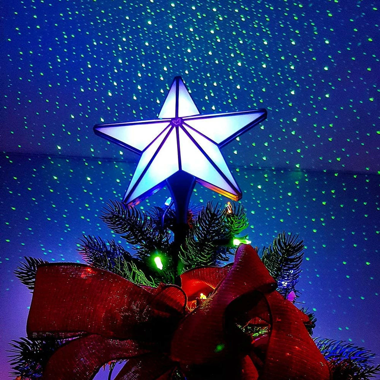 BlissLights Shining Star Christmas Tree Topper – Multicolored LED Light Show, Indoor Holiday Projector Lighting (Gold Trim, Green Stars)