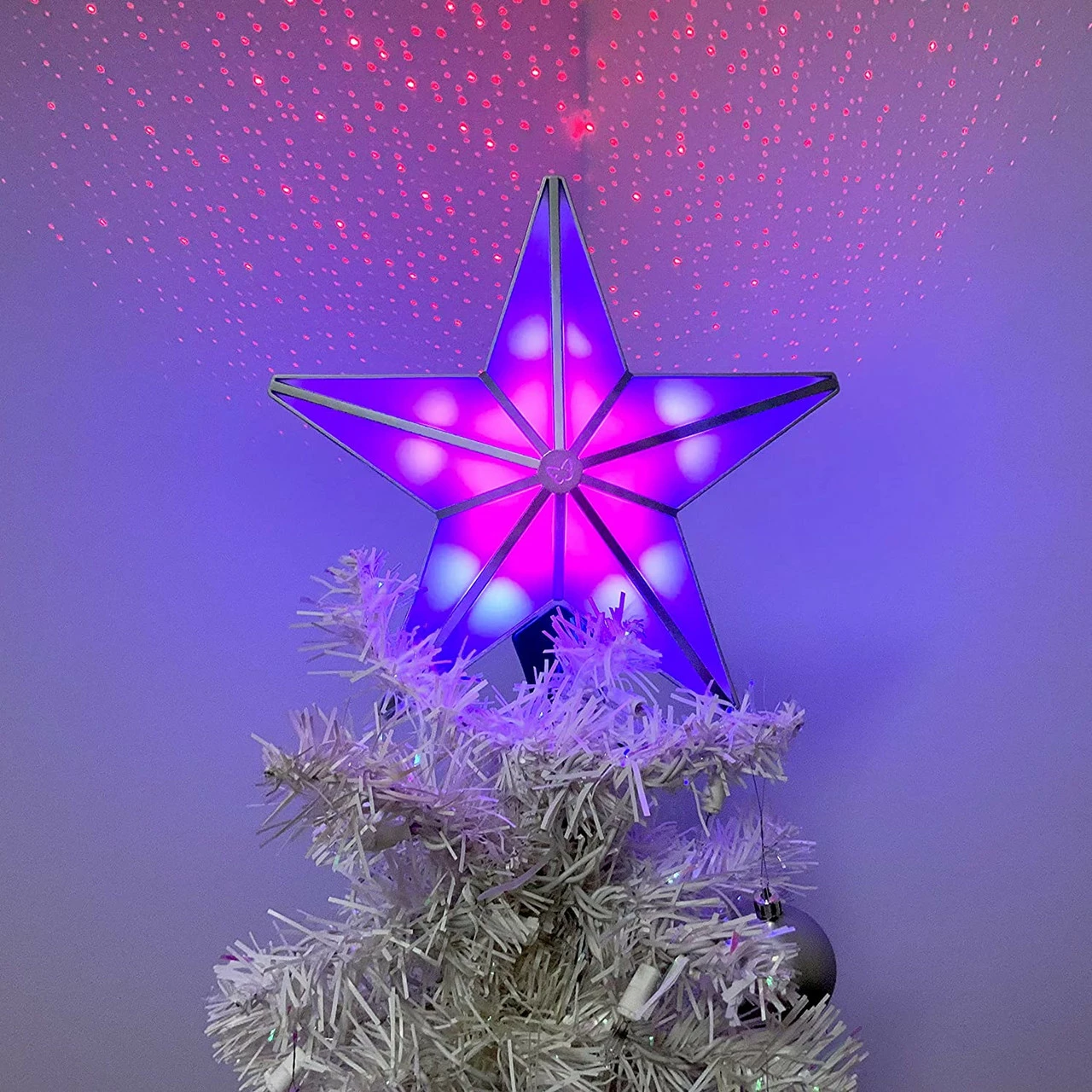 BlissLights Shining Star Christmas Tree Topper – Multicolored LED Light Show, Indoor Holiday Projector Lighting (Silver Trim, Red Stars)