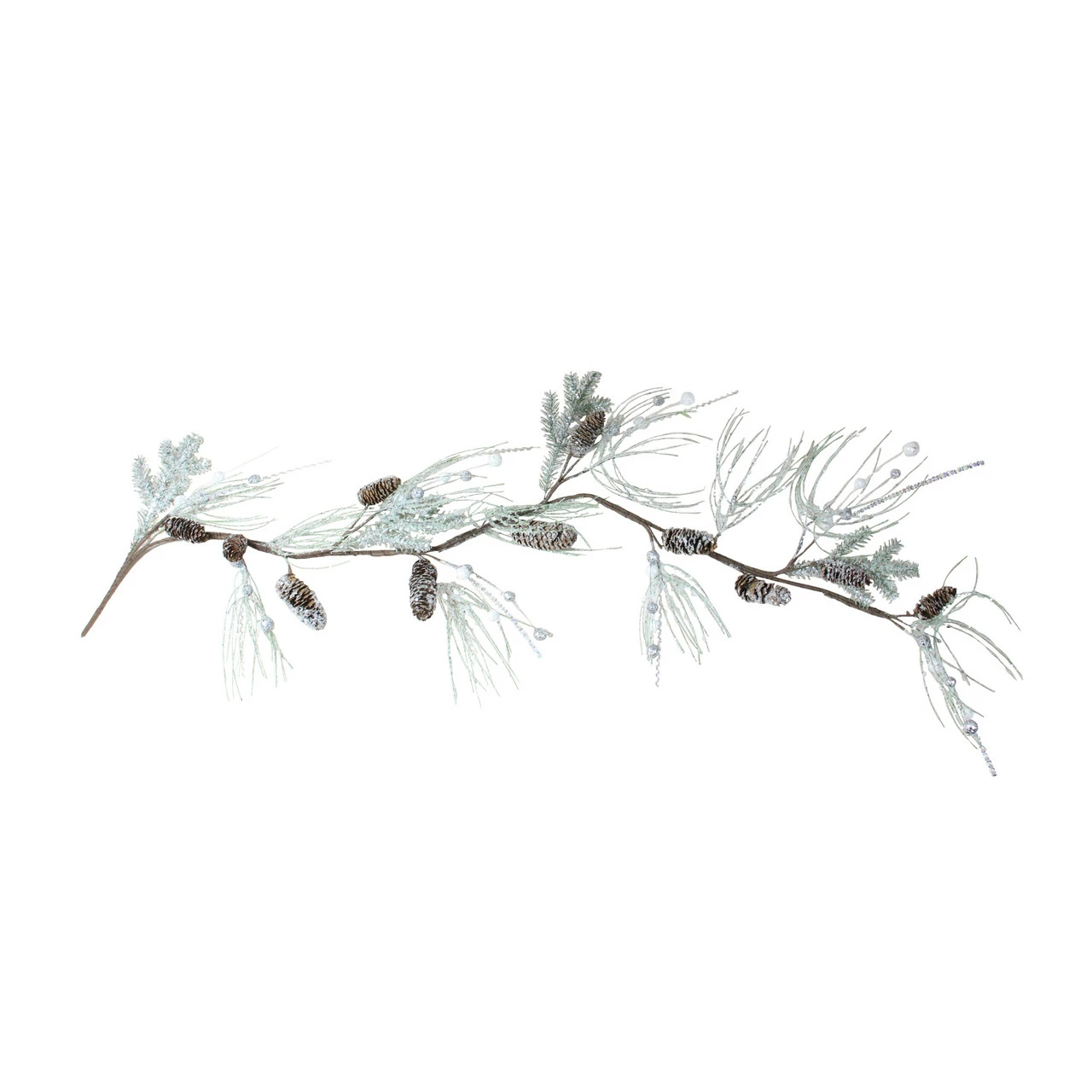 Features a frosted twig pine cone Christmas garland