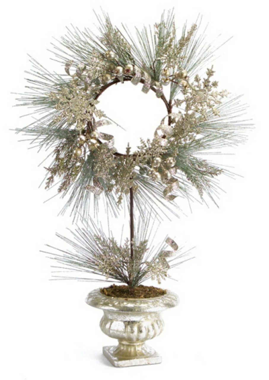 Wreath features long needle pine mixed with champagne gold snowflakes and ribbon