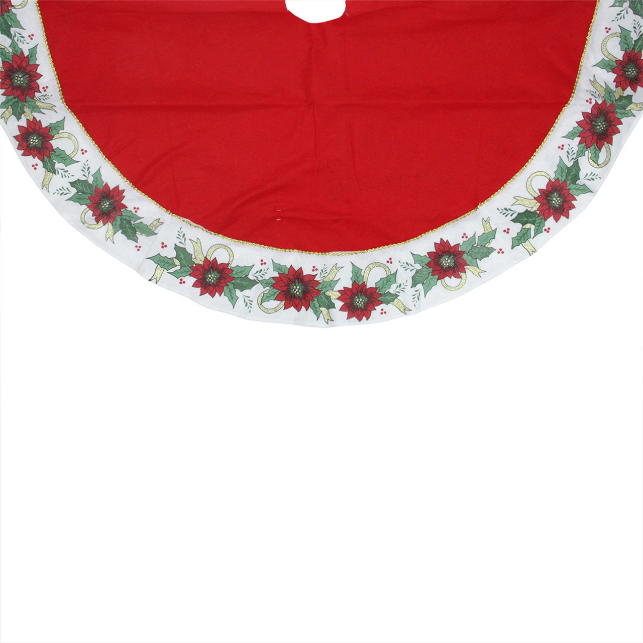 Traditional tree skirt features an illustration of poinsettia arrangements with gold ribbon dancing around the border