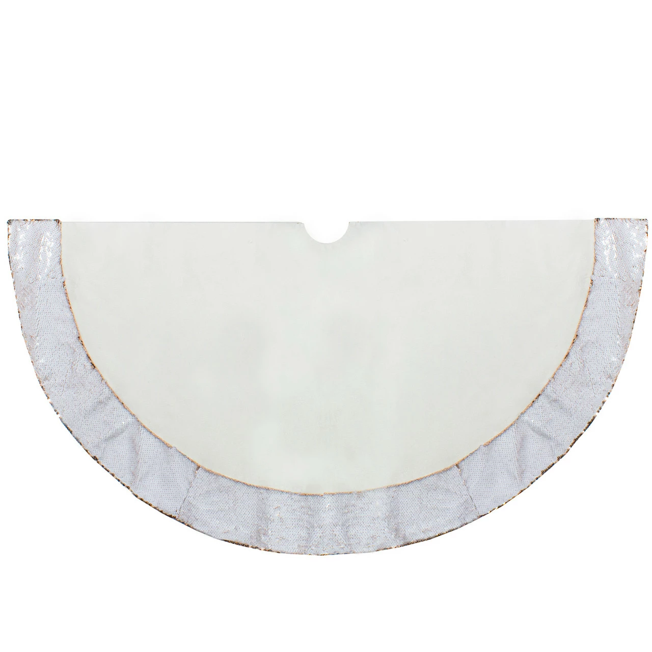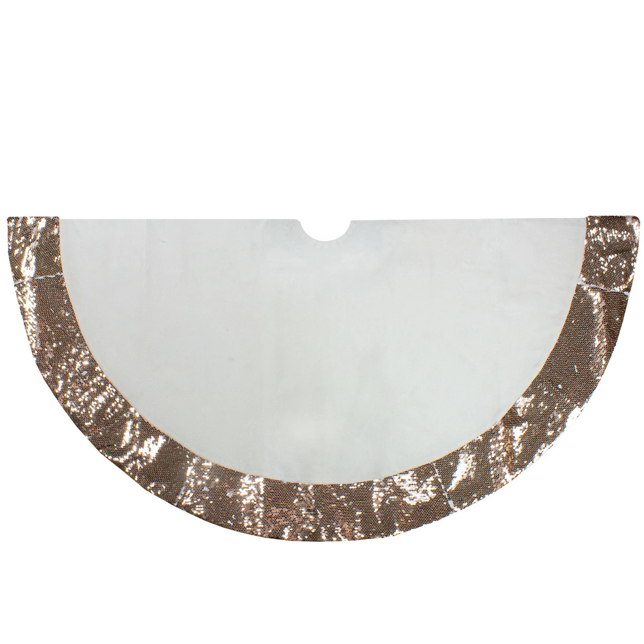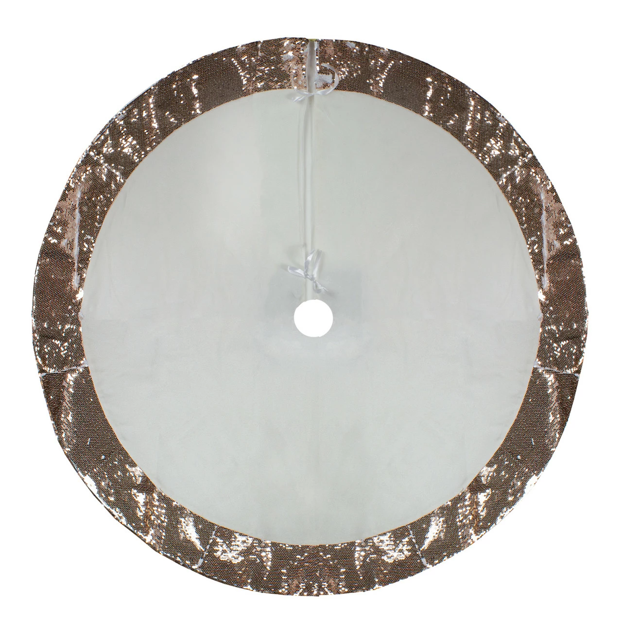 Tree skirt is solid white with a rose gold sequin trim