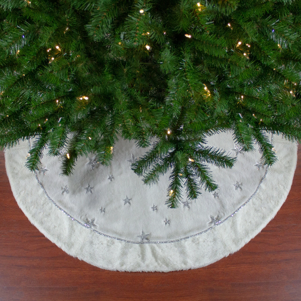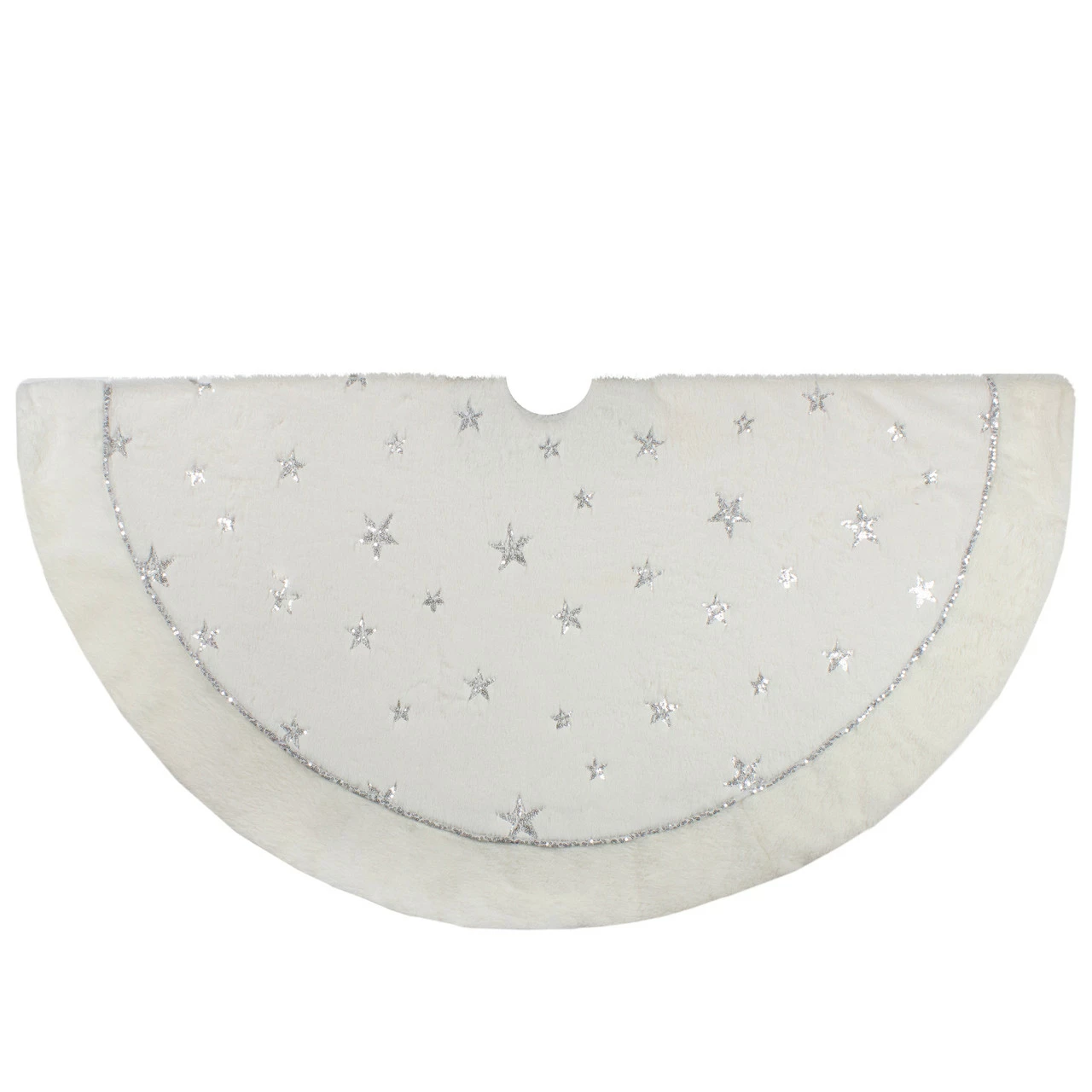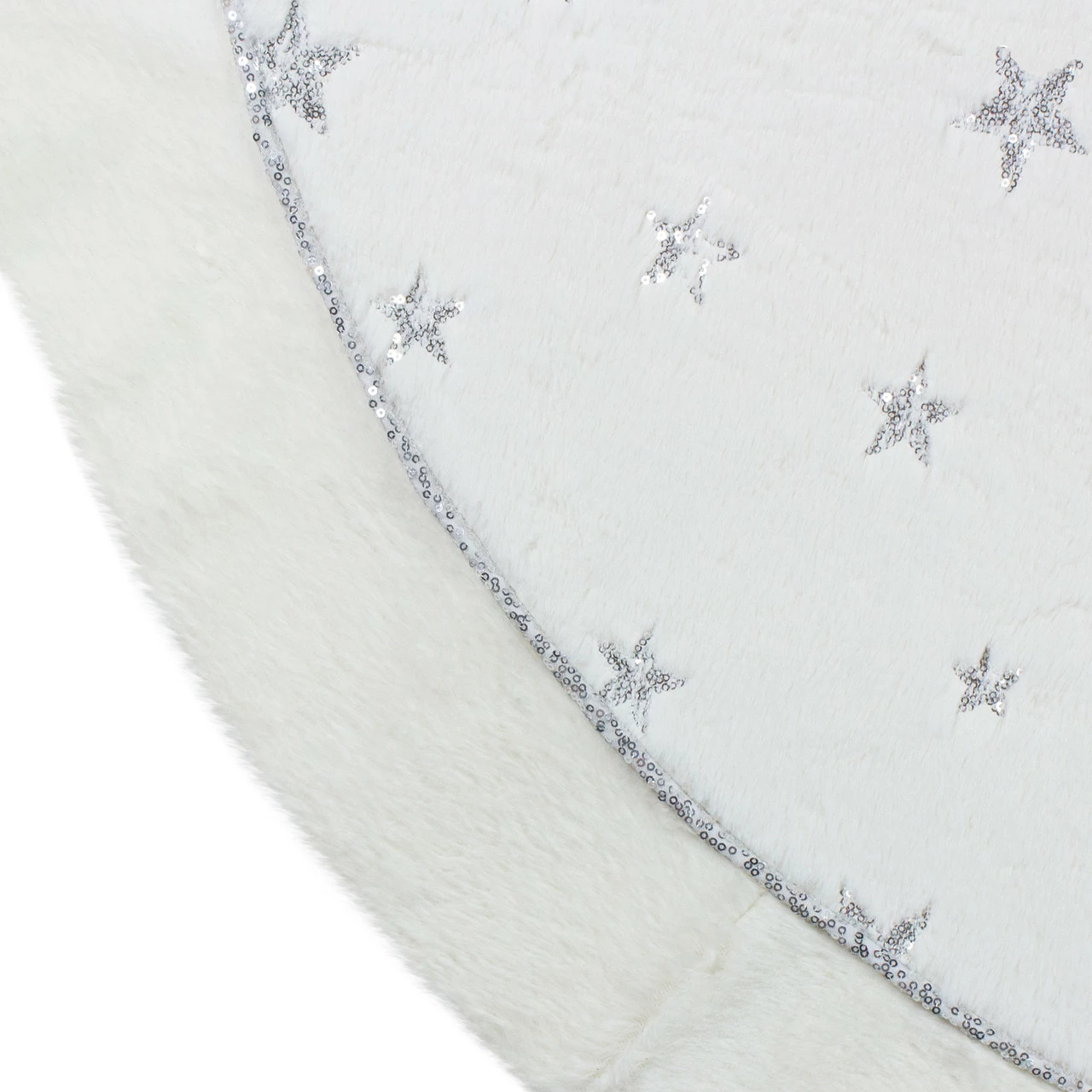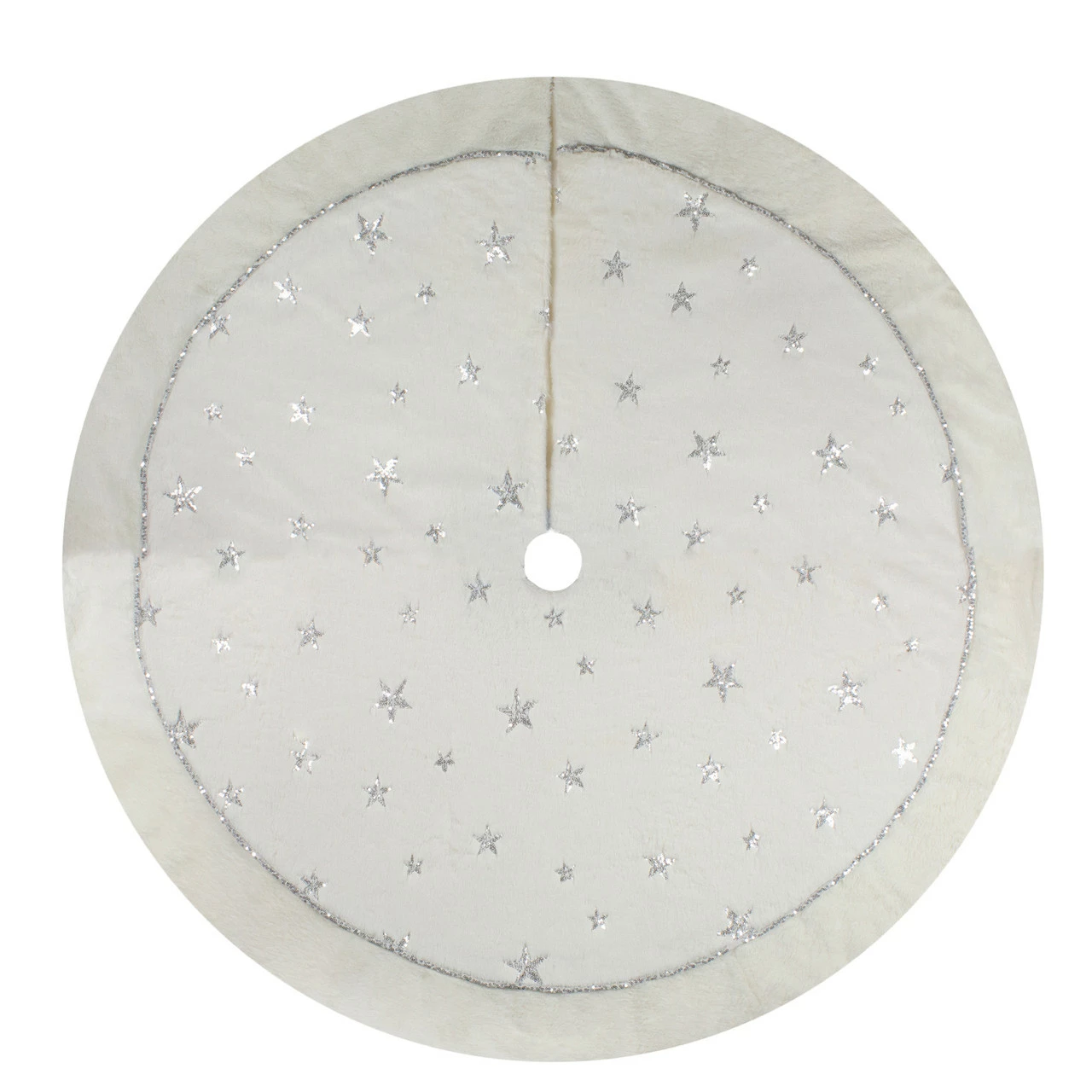 Tree skirt is solid white with silver sequin stars