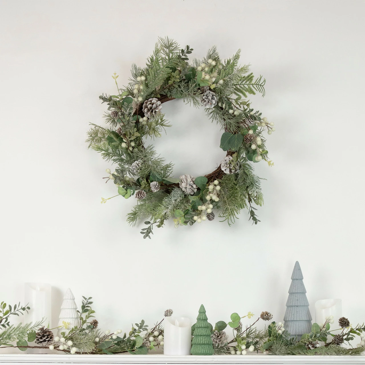 Designed with white berries and frosted pinecones