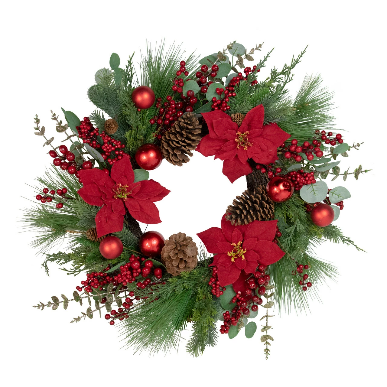 Green foliage, red berry and red poinsttia artificial Christmas wreath