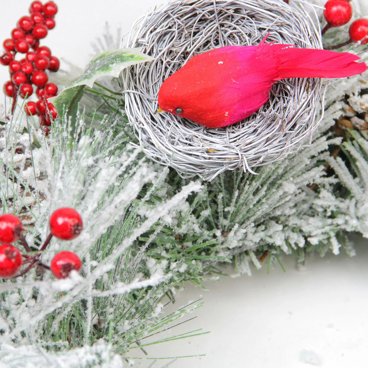 Generous flocking adds to the winter theme of this stunning wreath