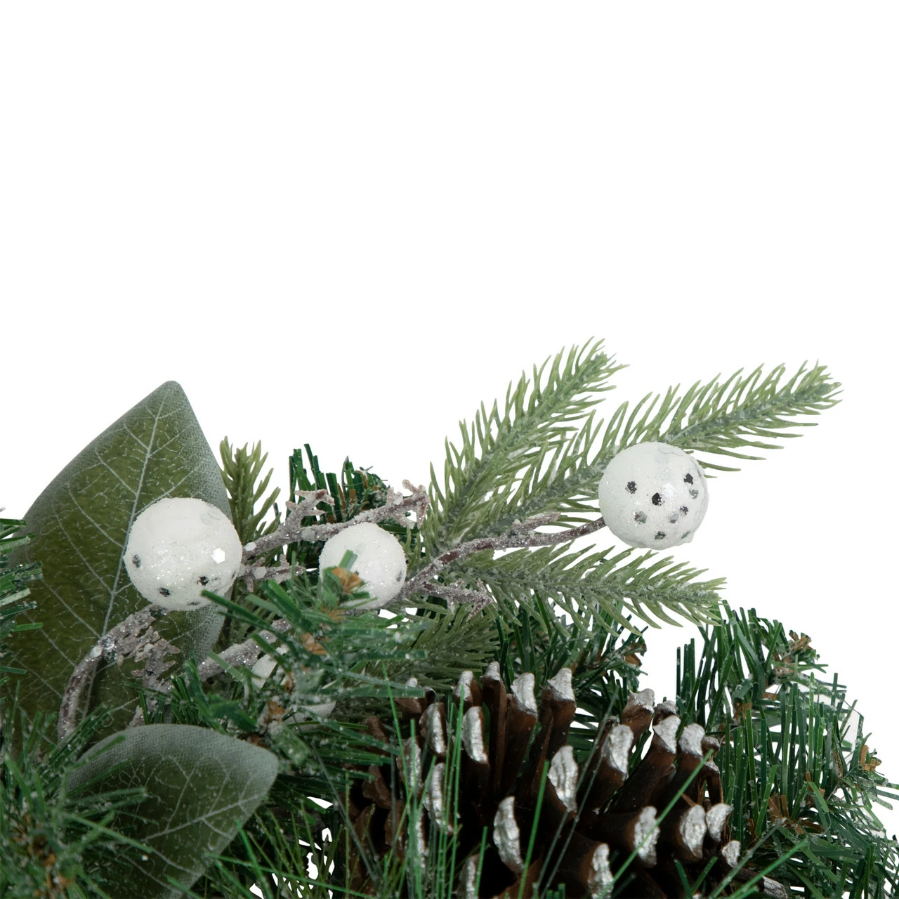 Filled with iced glittered white berries and brown pine cones
