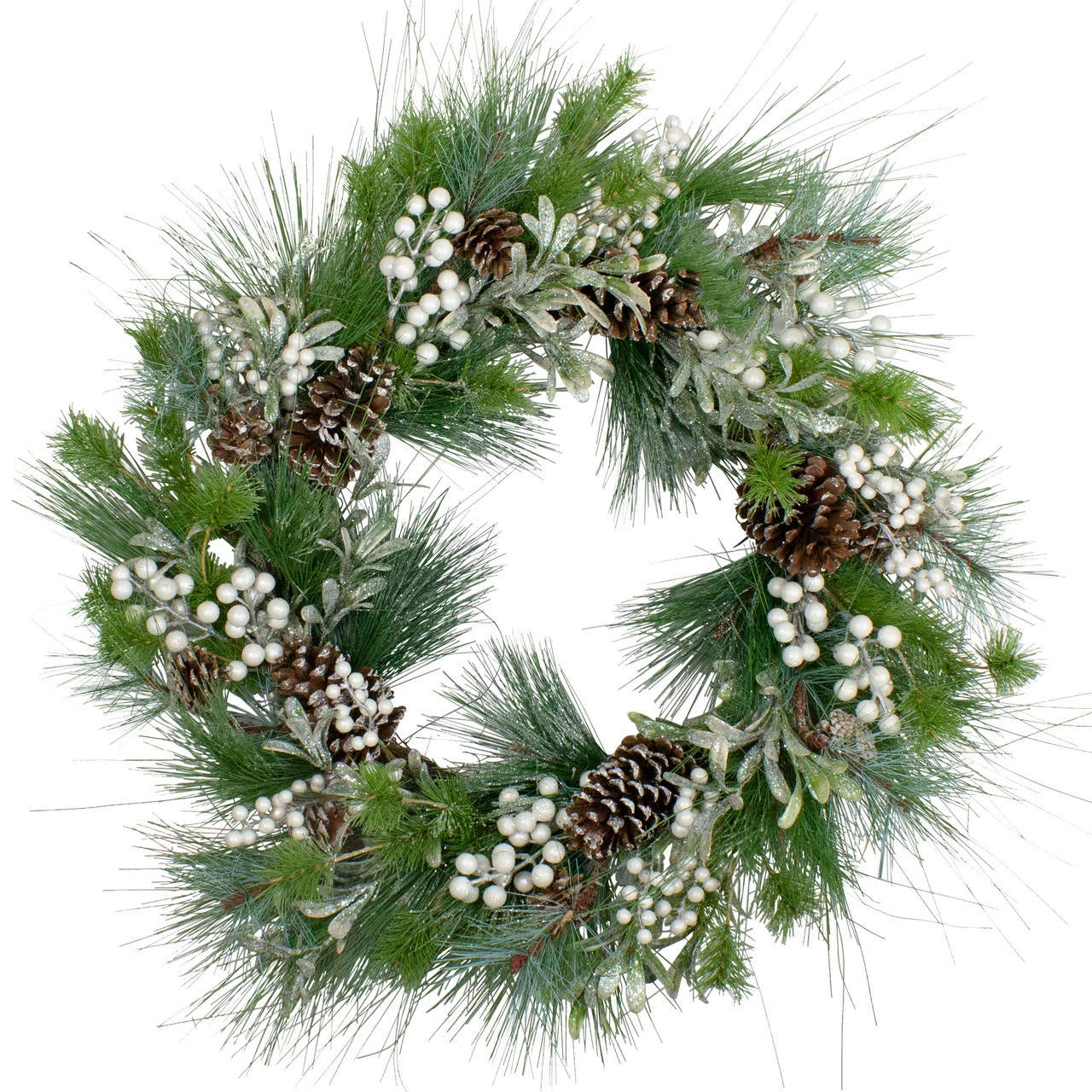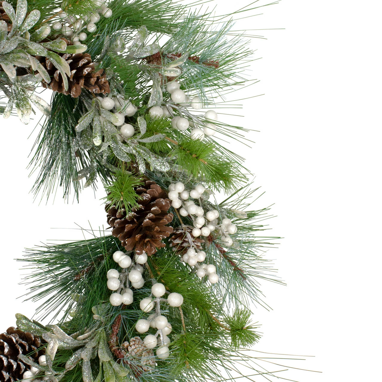Accented with white glittered berries and pinecones