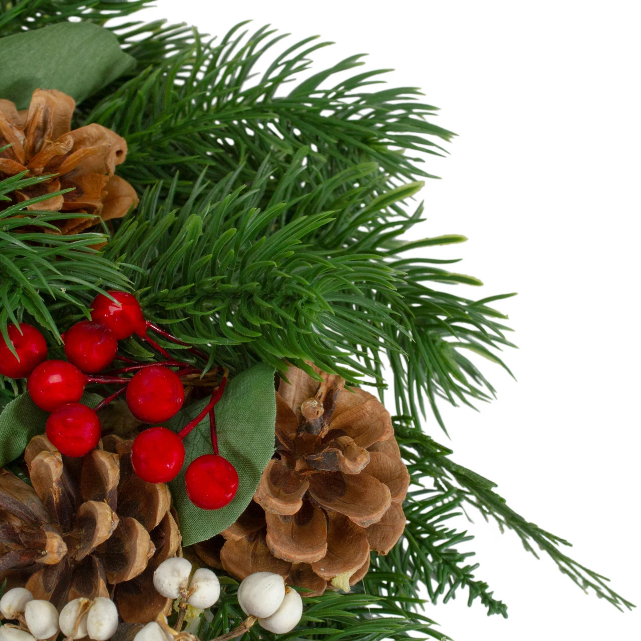 Features ornaments, flowers, berries, leaves, pinecones and cinnamon sticks