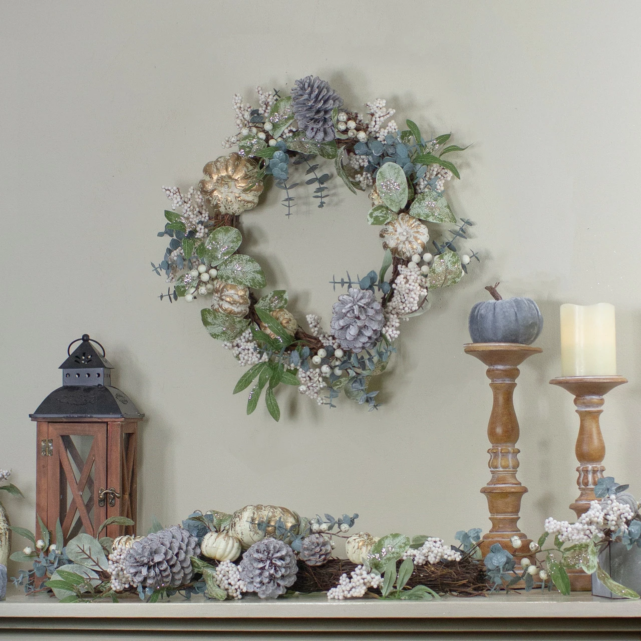 Gold distressed pumpkins and berries mix with white berries and pinecones for a pop of color
